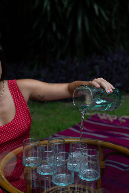Due to the handmade nature of our products, each is a work of art; a one-of-a-kind piece with slight variations in color, texture and shape. Our glassware is hand blown in Marrakesh and made of recycled glass. Sustainability never looked so good.